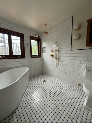 Perched near the Hollywood Sign, this once crooked, tile-clad bathroom got a full glam revival. We transformed it into a modern wet room with classic black and white tile, warm walnut accents, and brass fixtures that channel old Hollywood charm.